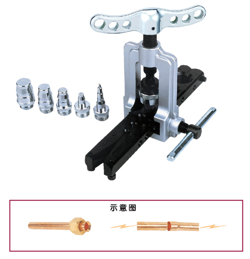 ●45°挤压型扩管&冲管器,比传统的扩管器操作更加省时小力. ●扩管锥通过快速挤压,能轻易的将管扩成精确的45。喇叭口并防止管件下滑,表面扩口很光滑及平整. ●5个冲管配件能涨3/16"到3/4" (6mm~19mm)的管,便于管与管之间的连接.