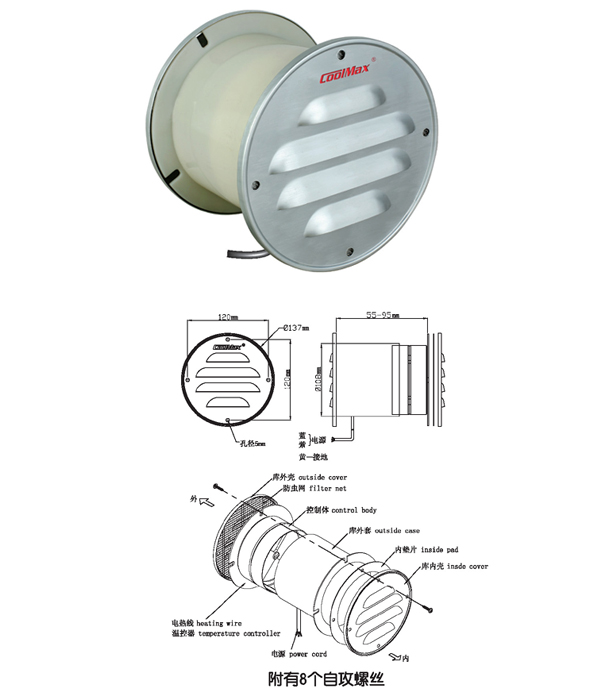 ●此压力平衡窗的作用在于, 当冷冻库的温度在零度以下时, 保持冷冻库内外的压力平衡,确保库门自如开关.●内附温度控制器, 如库内温度低于-40℃也可保持窗内温度在+20℃~40℃, 确保通风流畅不会冻结, 也不会过热.●内附一层不锈钢过滤网,可防止杂物进入.●窗页中间有个凹槽, 可以防止水渗入.●AC 220V 或 AC 110V 可任选.